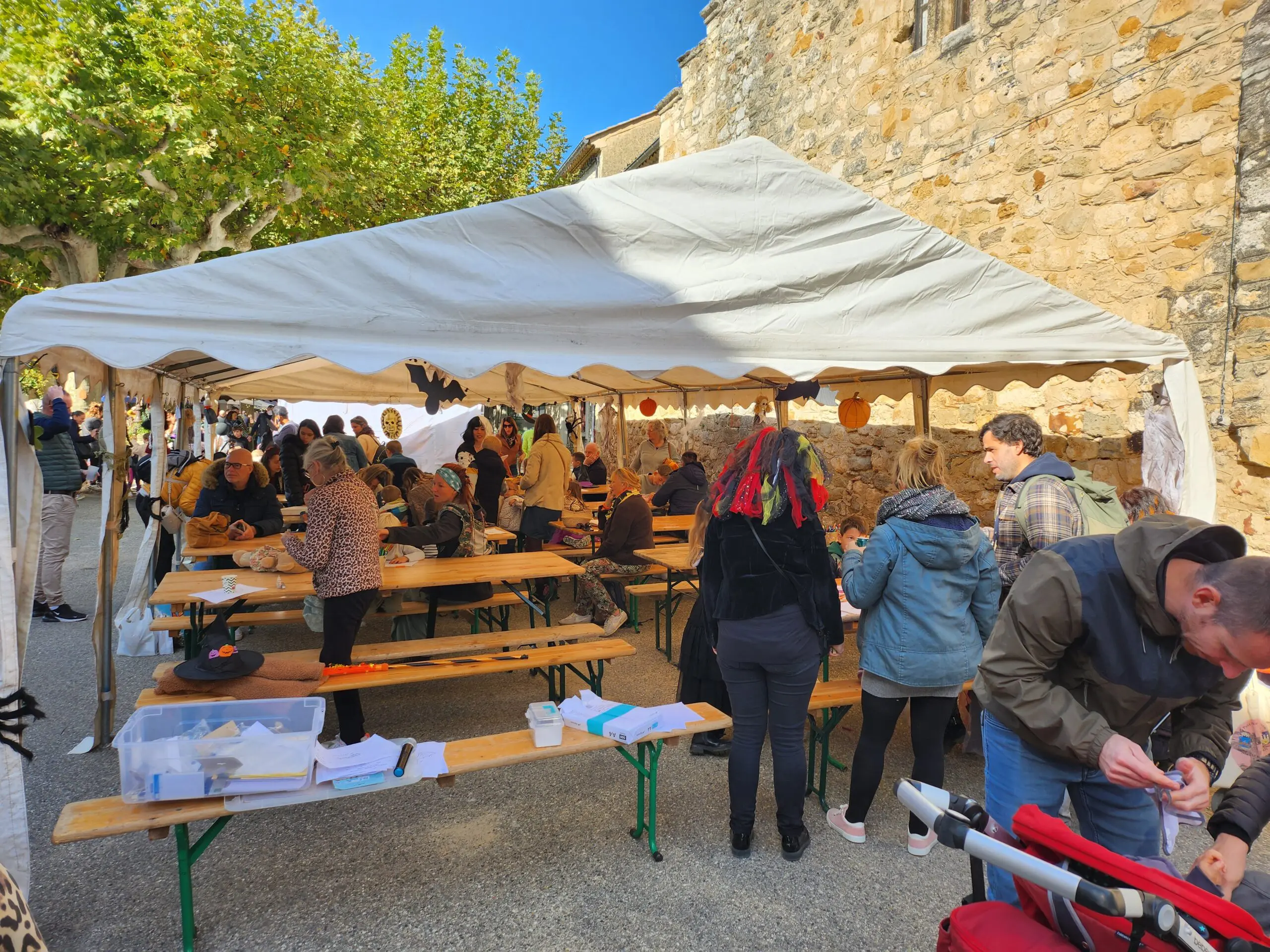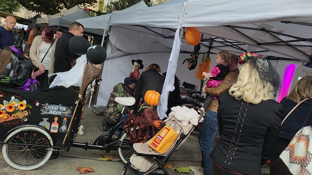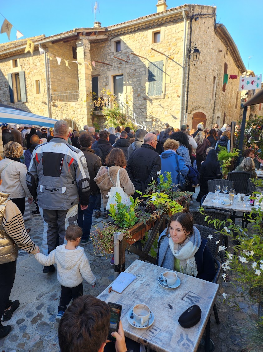 Dès 10h, le centre du village médiéval s’est transformé en un vaste marché accueillant plus de 70 exposants. Les stands proposaient une grande variété de produits : courges de toutes formes, confitures maison, bougies parfumées, objets artisanaux. Le soleil nous a accompagné toute la journée.