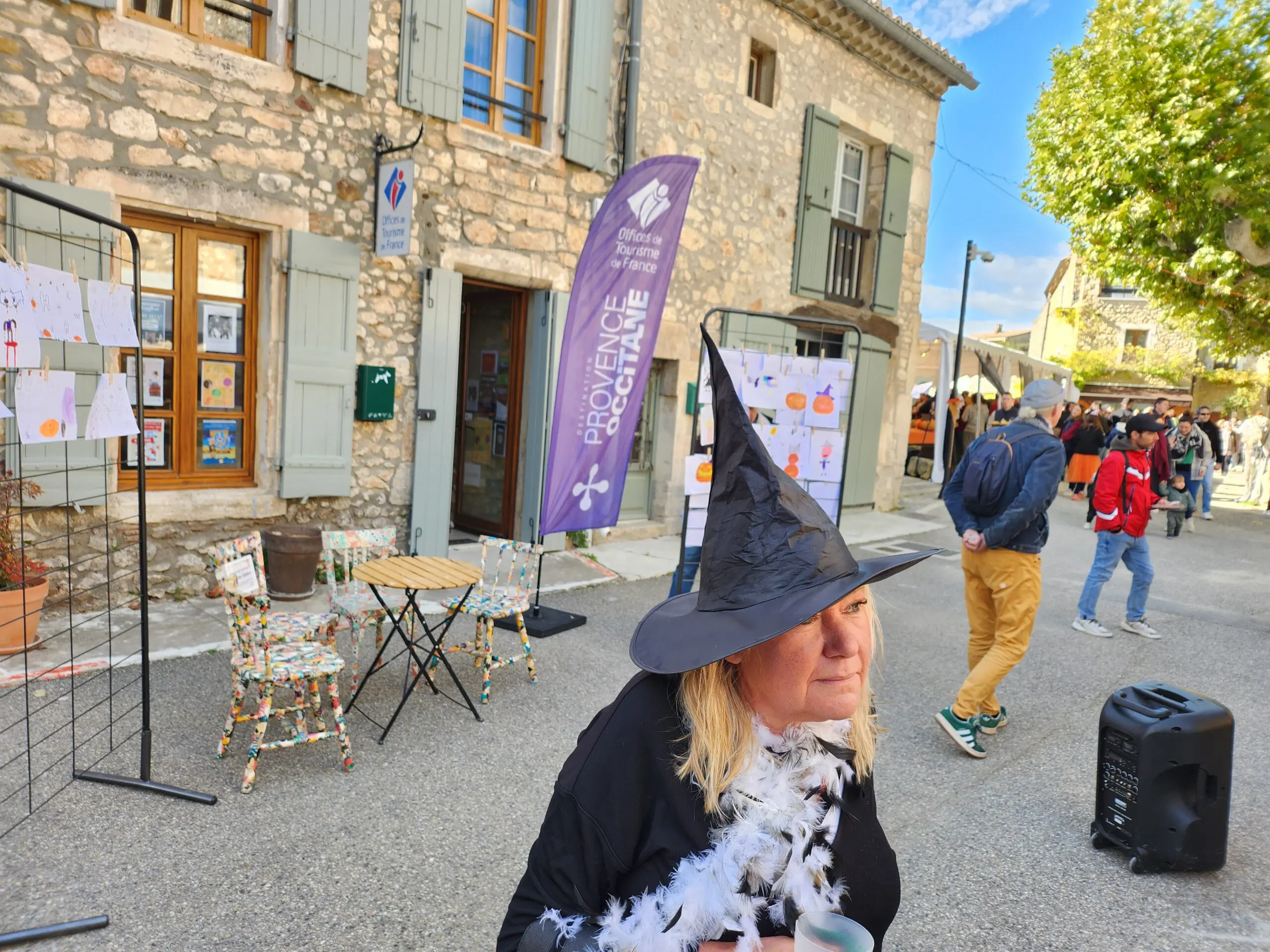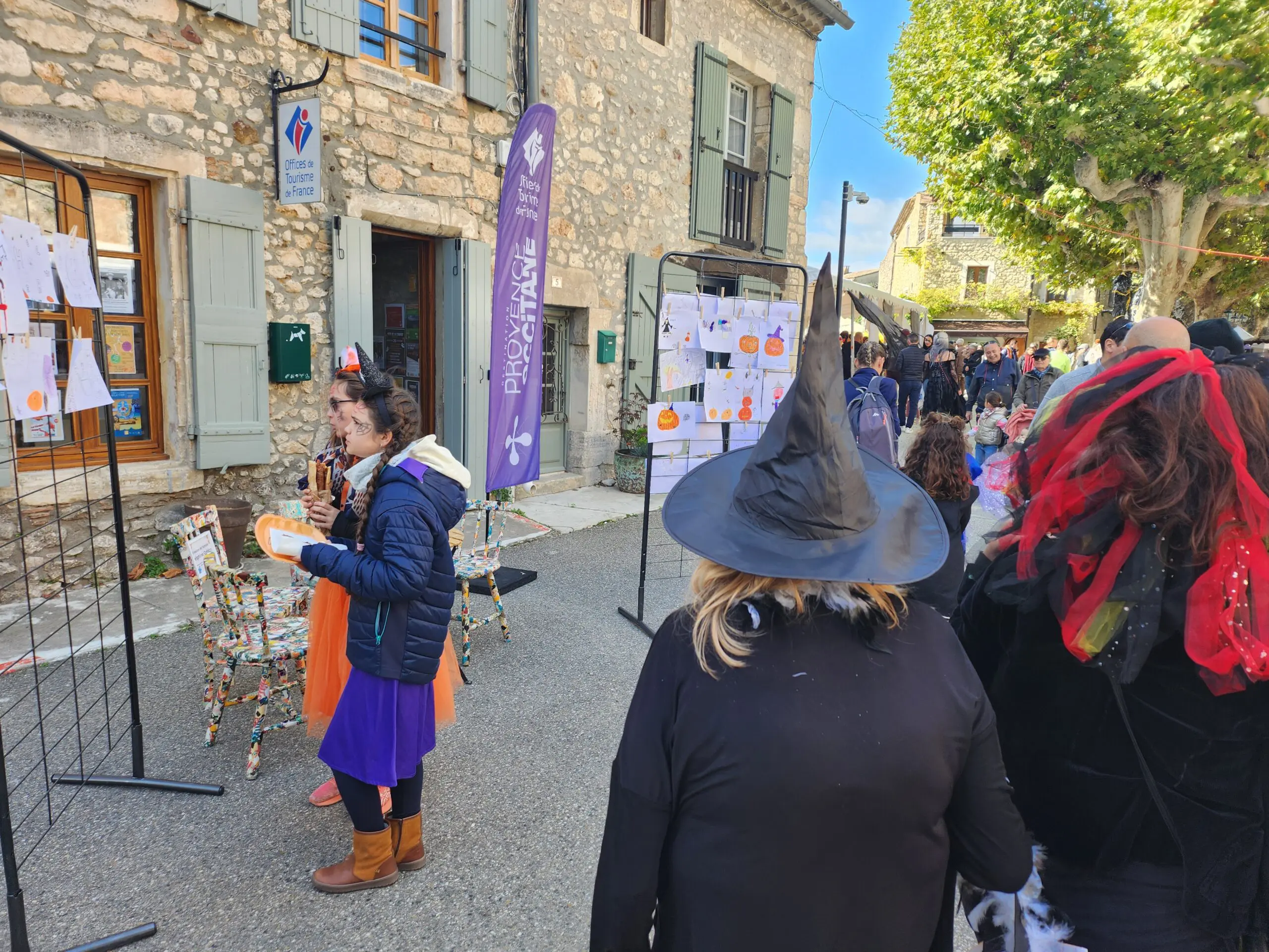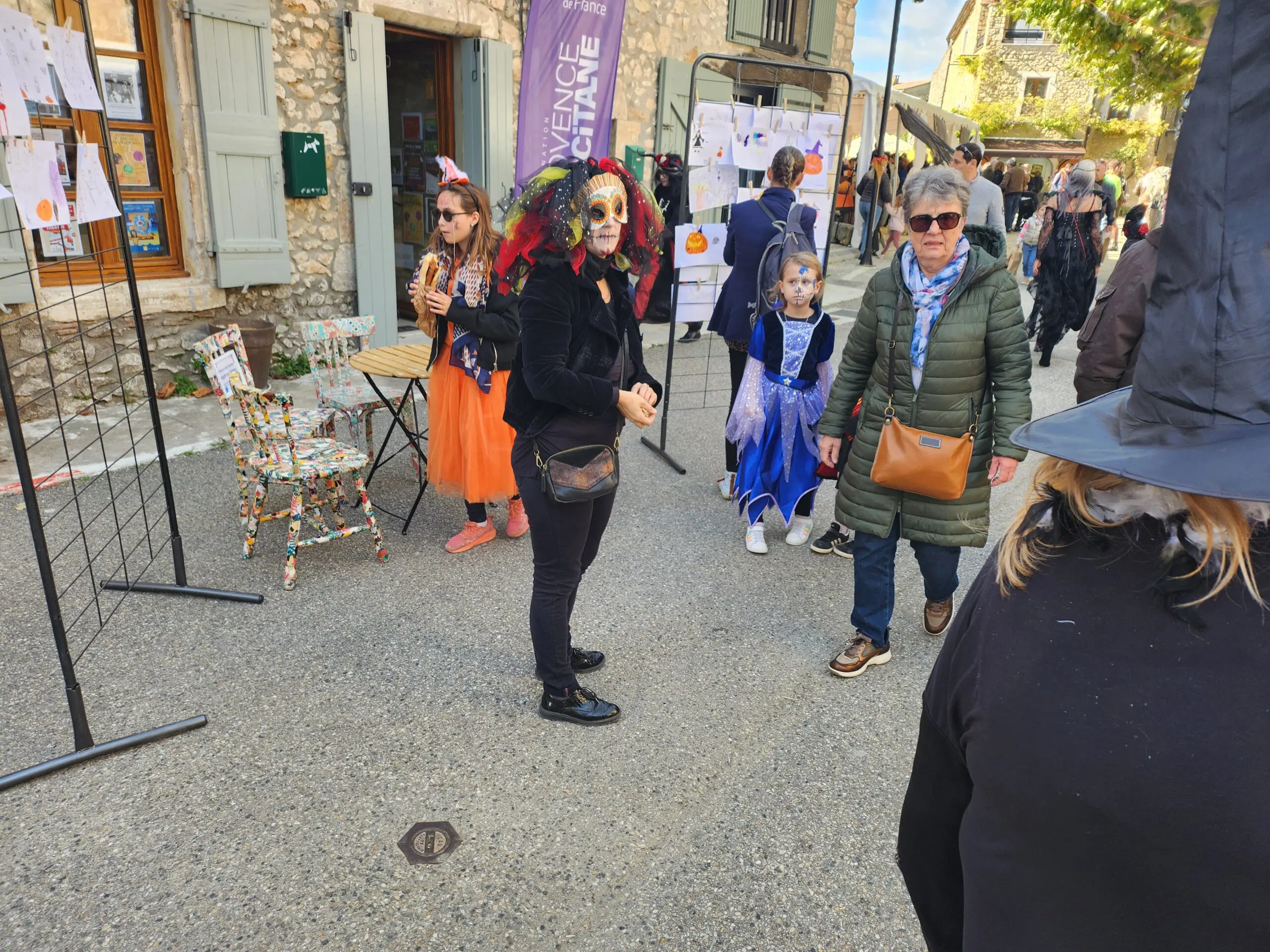Dès 10h, le centre du village médiéval s’est transformé en un vaste marché accueillant plus de 70 exposants. Les stands proposaient une grande variété de produits : courges de toutes formes, confitures maison, bougies parfumées, objets artisanaux. Le soleil nous a accompagné toute la journée.
